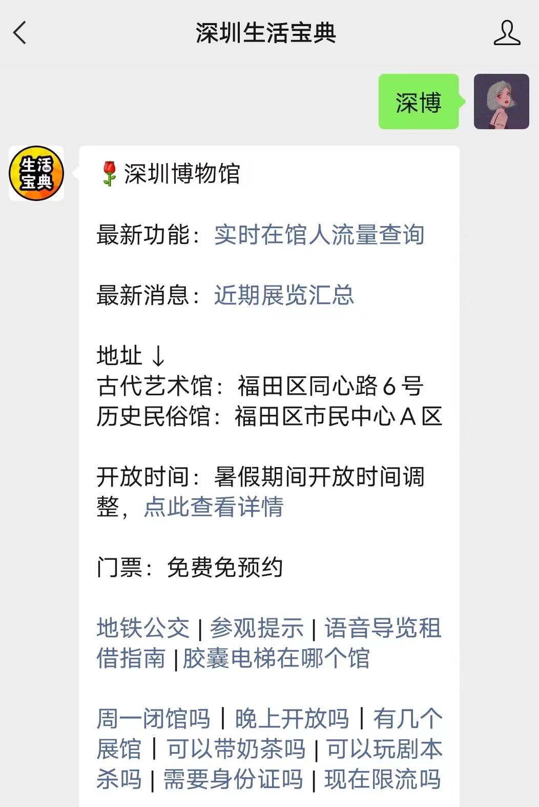 温馨提示:微信搜索公众号【深圳周末去哪玩】,关注后在对话框回复【深博】可获取深圳博物馆门票预约说明、实时人流量查询入口、地址交通停车场、开放时间、最新展览、入馆须知等