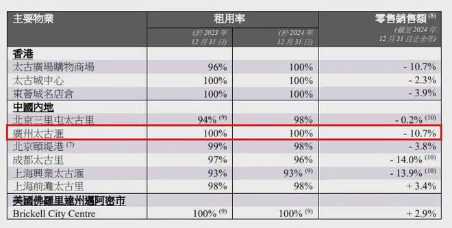 据太古地产2024年第四季度财报显示,广州太古汇租用率维持在100%,但零售销售额下降10.7%