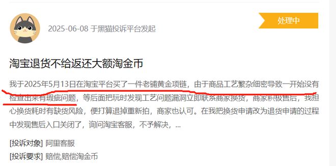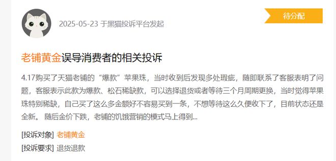较高的外包占比不仅增加产品品控难度,还可能削弱消费者对稀缺度的信任感。当越来越多的消费者意识到这一点,“代工”可能成为对老铺黄金失去兴趣甚至放弃购买的理由。浏览黑猫投诉,一些消费者的产品质量质疑已敲响了警钟。