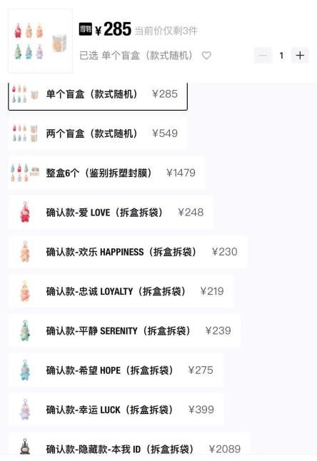 这股降价潮并不仅限于特定爆款,而是迅速蔓延至整个Labubu系列。千岛App今日数据显示,Labubu前方高能系列常规款的价格区间已回落至208元至385元,而隐藏款“本我”价格为2048元。Labubu同一系列在得物APP的今日数据显示,单个盲盒价格为285元,拆盒拆袋的价格区间为248元至399元,隐藏款价格则为2089元。