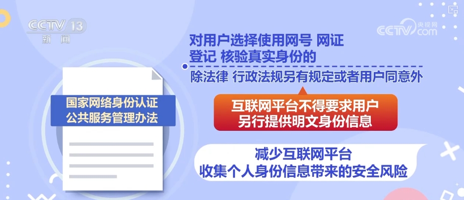 《管理办法》严格依照《个人信息保护法》等法律规定,充分保障公民个人信息权益。对用户选择使用网号、网证登记、核验真实身份的,除法律、行政法规另有规定或者用户同意外,互联网平台不得要求用户另行提供明文身份信息,从而减少互联网平台收集个人身份信息带来的安全风险。同时,《管理办法》也明确,国家网络身份认证公共服务平台应当按照“最小必要”原则收集信息,所收集的信息仅限网络身份认证所必要的信息,不得收集其他信息。