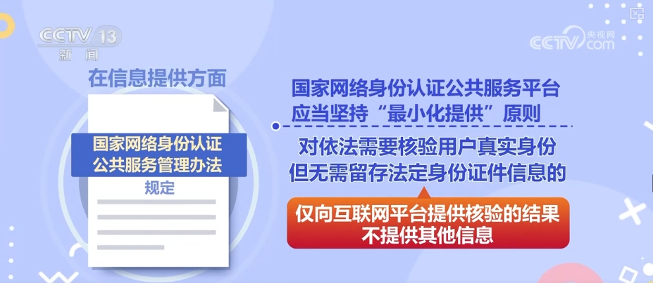 在信息提供方面,《管理办法》规定,国家网络身份认证公共服务平台应当坚持“最小化提供”原则,对依法需要核验用户真实身份但无需留存法定身份证件信息的,仅向互联网平台提供核验的结果,不提供其他信息。对依法确需获取、留存用户法定身份证件信息的,经用户单独同意,公共服务平台可以向互联网平台提供必要的明文身份信息。国家网络身份认证 防范个人信息泄露