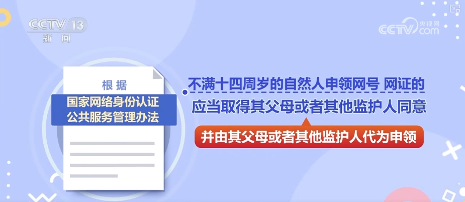 根据《国家网络身份认证公共服务管理办法》,不满十四周岁的自然人申领网号、网证的,应当取得其父母或者其他监护人同意,并由其父母或者其他监护人代为申领。已满十四周岁未满十八周岁的自然人申领网号、网证的,应当在其父母或者其他监护人的监护下申领。