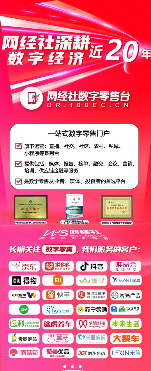网经社数字零售台是一站式数字零售门户,旗下运营:直播、社交、社区团购、农村、生鲜、汽车、二手、母婴等系列频道,提供包括:媒体、报告榜单、融资、会议、营销、培训、供应链融资等。