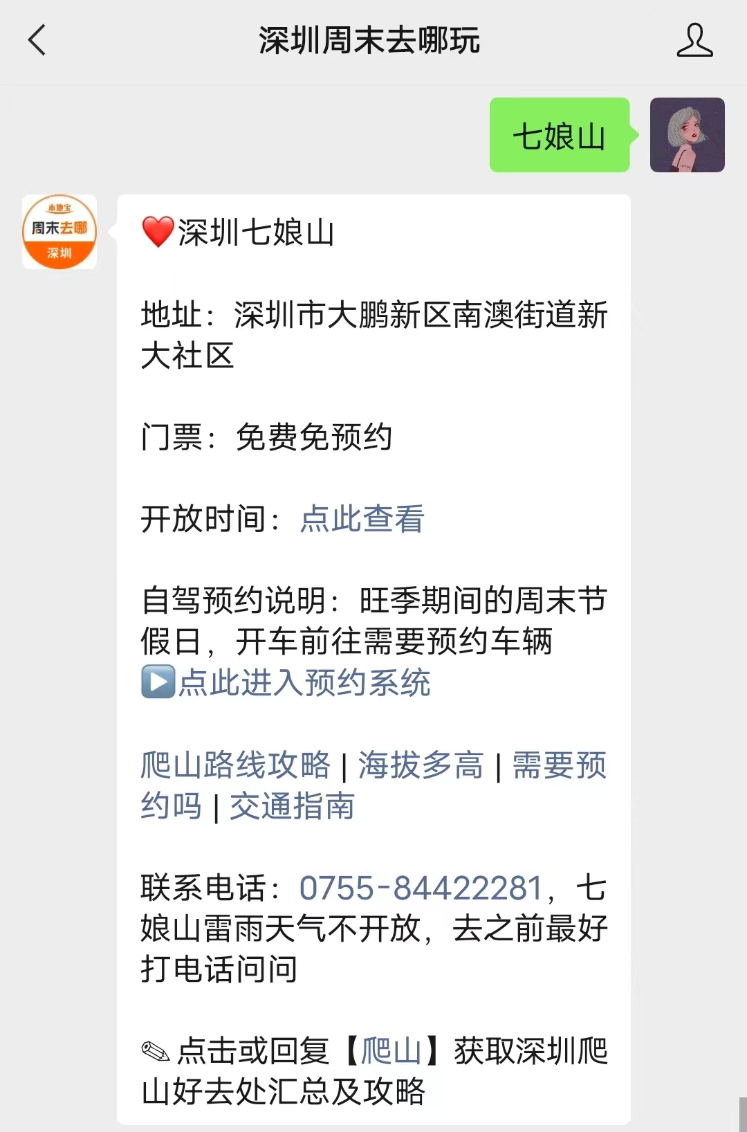 温馨提示:搜索微信公众号【深圳周末去哪玩】,关注后,在对话框发送【七娘山】可获取深圳七娘山开放时间、地址交通、登山入口、门票说明、海拔高度、自驾预约入口、爬山路线攻略等信息