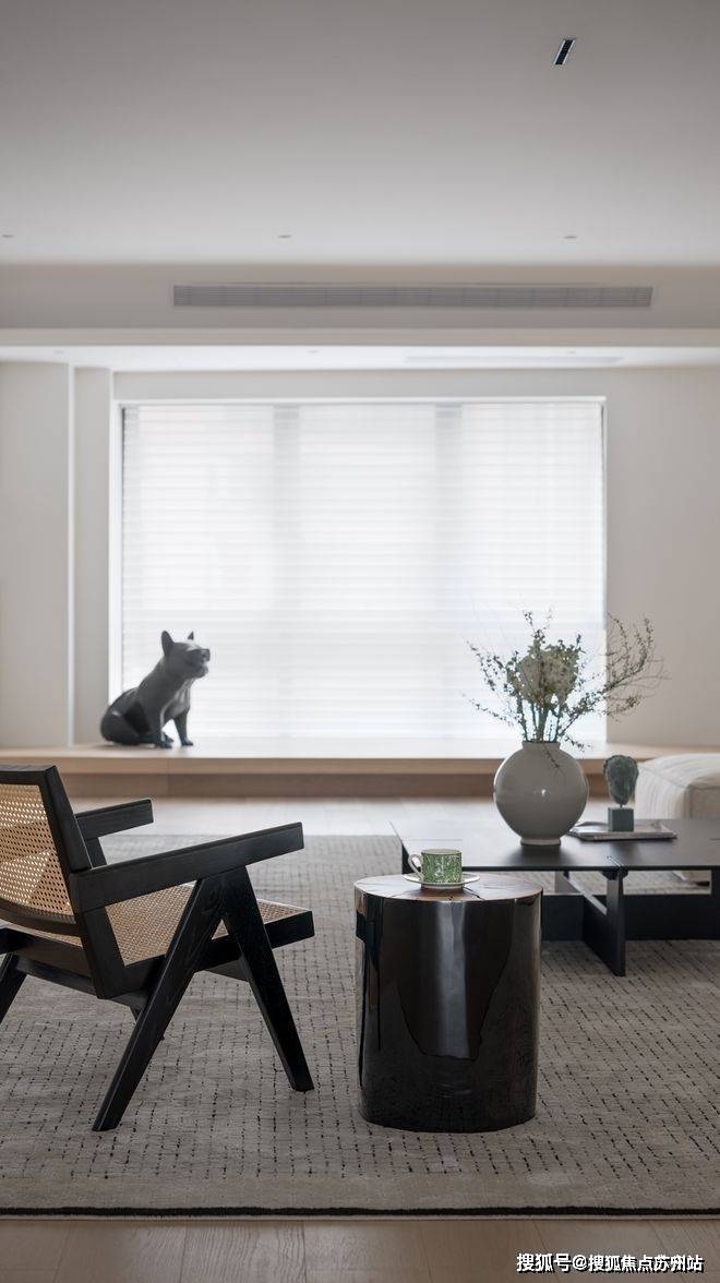 原厨房大面积的落地窗拆除后,自然光线在空间肆意流淌,如卷轴横幅开展的大面窗景,拉长视觉尺度,形成平和宁静的基调。