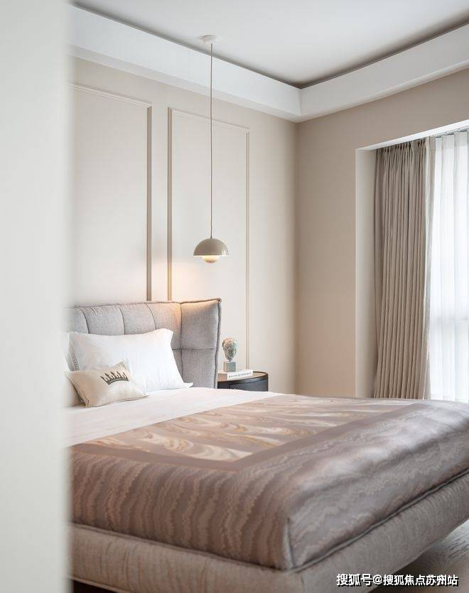 主卧,整洁宁静的配色,呈现至简至美的气质,细腻简约的饰面,床头背景墙的法式线条元素,原木质感的材质,柔和的灯光设计让空间富有节奏感。