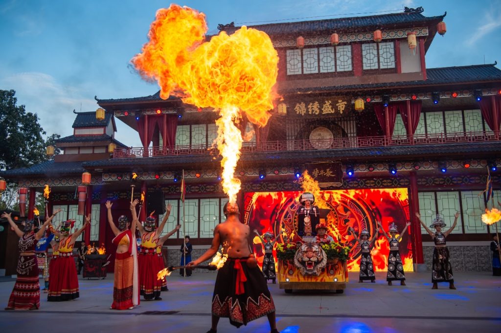 当夜色降临,深圳锦绣中华“水火交融”的极致演艺将掀起新一轮高潮。每晚20:40,《彝族火把狂欢巡游》从锦绣楼启幕,游客可在巡游队伍的指引下随队前行,汇聚至泼水广场欣赏一场《鹏城TOP级绝技火秀》,火刀、火流星、吞火喷火等绝技轮番登场,构建“水火交融”的沉浸式视觉奇观。这一水火兼容、动静结合的创意演艺,既是民族民俗文化的现代演绎,也是锦绣中华持续创新夜游产品、丰富暑期供给的精彩体现。从白日泼水到夜间火舞,锦绣中华通过时间轴的艺术编排,打造“清凉与炽热并存”的立体游玩节奏,让游客真正实现从“白天嗨到黑夜”的高密度体验。