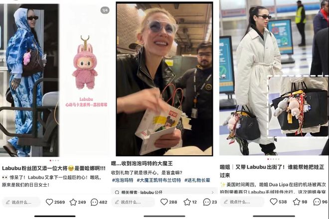今年2月,天后级女歌手蕾哈娜在洛杉矶机场被拍到拥有一只粉色Labubu“包搭子”,被网友戏称是“Labubu闯美成功”。