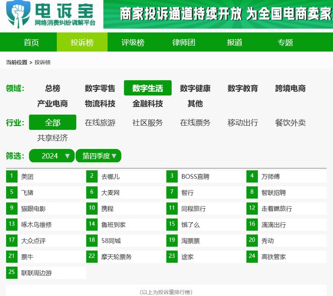 投诉量TOP10依次为:美团、去哪儿、BOSS直聘、万师傅、飞猪、大麦网、智行、智联招聘、猫眼电影、携程;