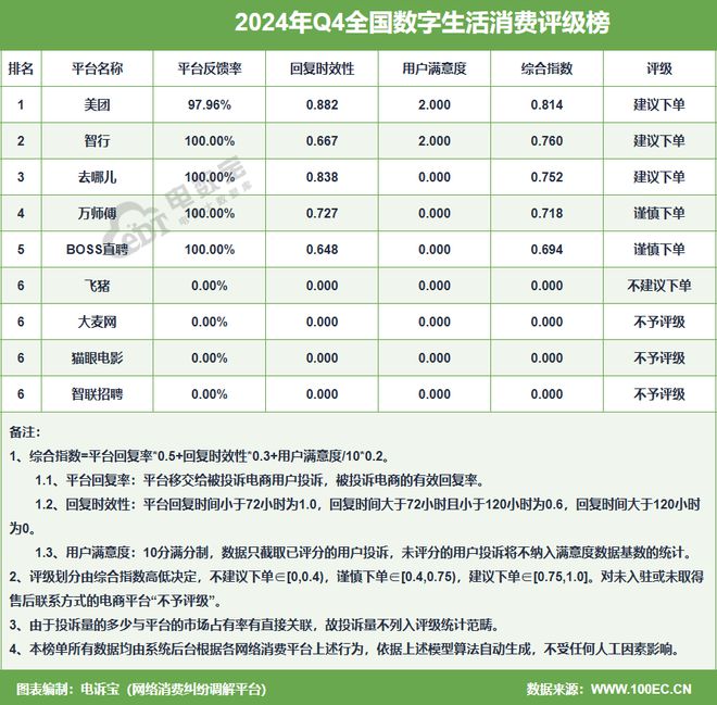 在2024年Q4全国数字生活评级榜中:获“建议下单”的有:美团、智行、去哪儿傅等3家;获“谨慎下单”评级的有:BOSS直聘、万师傅等2家;获“不建议下单”的有:飞猪等1家;获“不予评级”的有:大麦网、猫眼电影、智联招聘。