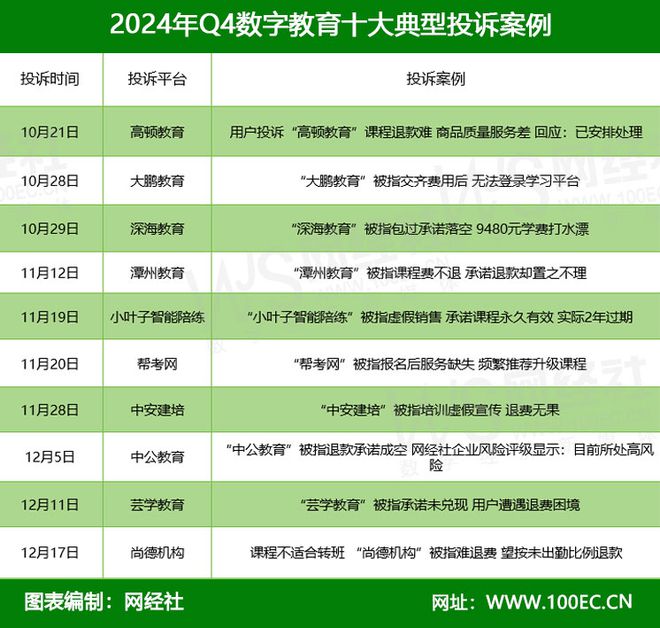 在数字教育消费领域,据“电诉宝”受理用户维权案例,我们从中选取十大典型投诉案例,涉及高顿教育、大鹏教育、深海教育、潭州教育、小叶子智能陪练、帮考网、中安建培、中公教育、芸学教育、尚德机构。