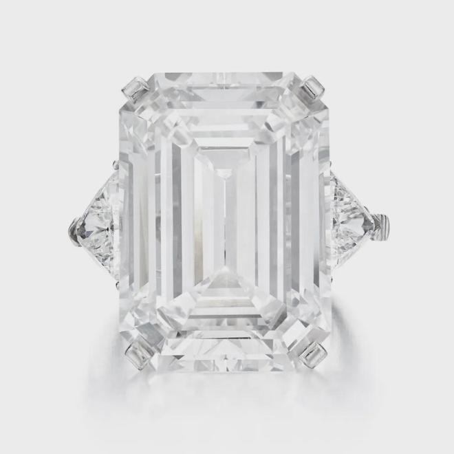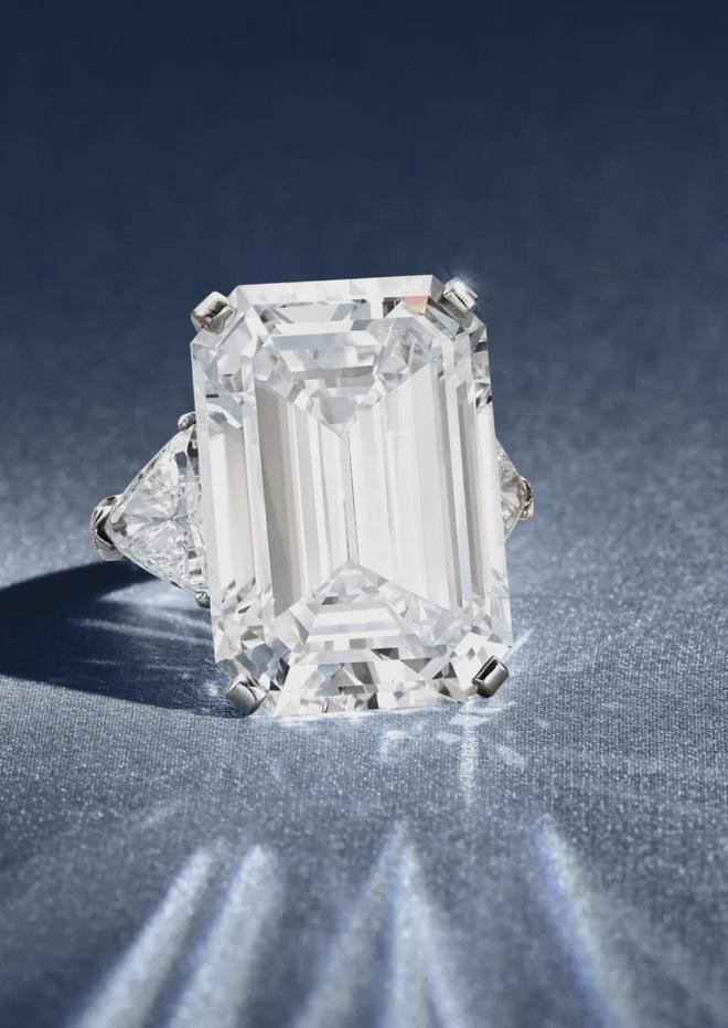 ↑ Sotheby’s 本年度纽约珠宝春拍中全场成交价最高的拍品——一枚35.01ct祖母绿型切割钻石戒指,D 色,VVS2 净度,Type IIa 型,镶嵌两枚三角形切割钻石,成交价高达322万美元,超过初始估价上限