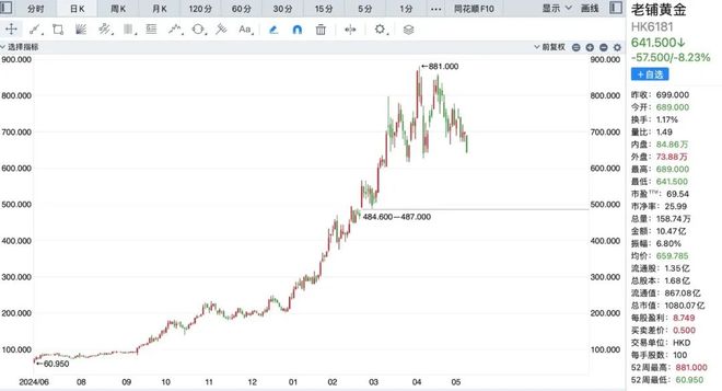 回顾老铺黄金的上市历程,可谓是一路高歌猛进。2024年6月港股上市时,全球发售及行使超额配股权的所得款项净额约为9.57亿港元。自上市以来,其股价犹如坐上火箭,较40.5港元/股的发行价最高上涨超过20倍,在今年4月2日一度达到881港元/股。截至5月12日下午收盘,老铺黄金报收645.50港元/股,日跌幅7.65%,总市值高达1086.81亿港元。整体亮眼的股价表现背后,是其出色的业绩支撑。2024年,尽管消费市场充满不确定性,老铺黄金却逆势上扬,多地门店大排长龙,业绩与股价齐飞。财报显示,2024年其营收同比大涨167.5%至85.06亿元;净利润增长253.9%至14.73亿元。更令人惊叹的是,这一成绩仅由36家自营门店及线上渠道销售构成,平均每家门店店效高达3亿元。