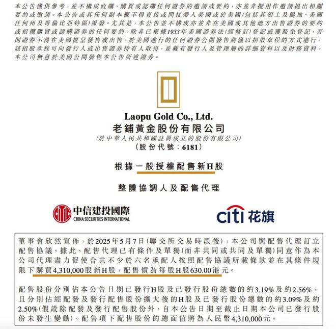 在资本市场的风云变幻中,老铺黄金的一举一动都备受瞩目。这家挂牌上市仅10个月,股价一度暴涨超20倍的黄金品牌,近日又有大动作。5月8日,老铺黄金(发布公告,在5月7日盘后与花旗和中信建投国际订立配售协议,拟配售431万股新H股,占公司已发行H股及已发行股份总数的约3.19%及约2.56%,每股配售价630港元,较5月7日收市价每股685港元折让约8.03%。此次预计配售所得款项总额为27.15亿港元,经扣除佣金及估计开支后所得款项净额为26.98亿港元,如此大规模的融资额度,瞬间成为财经领域热议焦点。