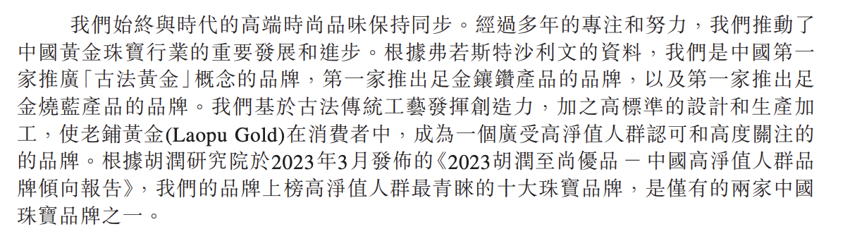 根据弗若斯特沙利文的资料,老铺黄金是中国黄金珠宝市场主要品牌中唯一专注设计、生产加工和销售古法黄金产品的品牌,是中国第一家推广「古法黄金」概念的品牌,第一家推出足金镶钻产品的品牌,以及第一家推出足金烧蓝产品的品牌。