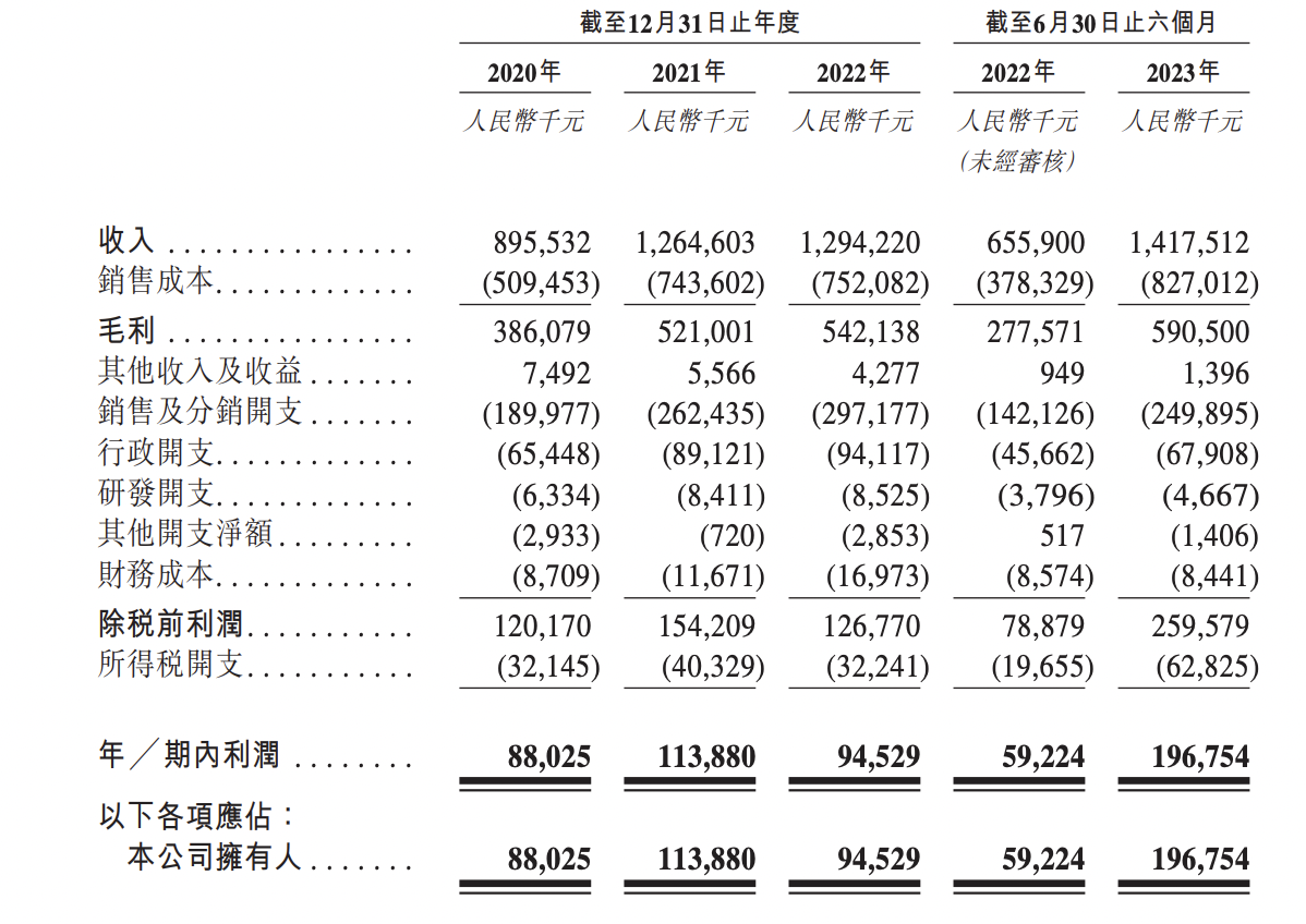 业绩方面,2020年-2023年上半年,老铺黄金的营业收入分别为8.96亿元、12.65亿元、12.94亿元和14.18亿元,相应的净利润分别为0.88亿元、1.14亿元、0.95亿元和1.97亿元。