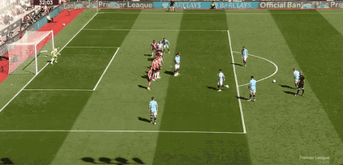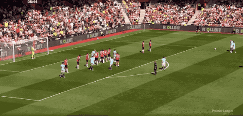 第32分钟,德布劳内制造了禁区线附近的任意球,德布劳内亲自操刀,皮球绕过人墙,稍稍高出。