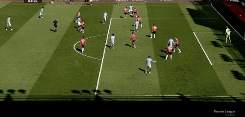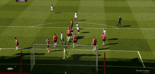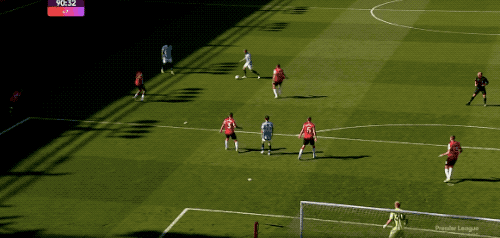 第60分钟,德布劳内虚晃一枪,福登的任意球落点极佳,哈兰德被防守球员压制,没能完成射门。