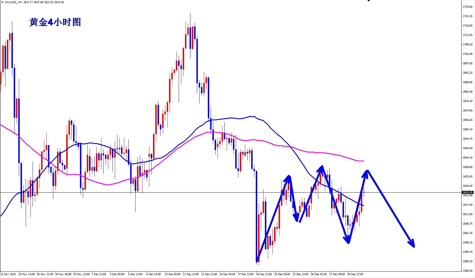 黄金4小时均线还是死叉向下发散的形态,黄金4小时短线小时均线附近,那么黄金下周如果强势突破站稳了2640上方,那么黄金才可能真正的转多,不然黄金还是会继续震荡,黄金多头也就缺少进一步上涨的信心。