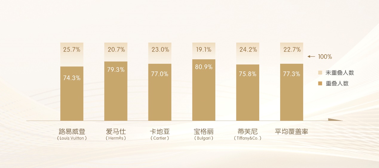 据弗若斯特沙利文调研数据显示,老铺黄金消费者与路易威登、爱马仕、卡地亚、宝格丽等国际五大奢侈品牌的消费者平均重合率接近八成,这意味着国际奢侈品牌消费者越来越多转向老铺黄金,而中国品牌也首次成为高端消费的主流力量。
