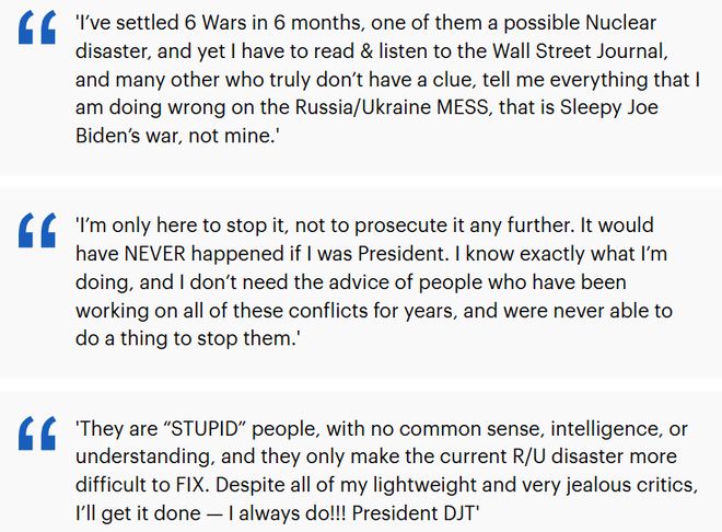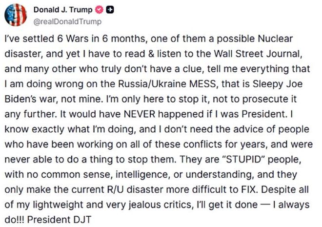 川普还声称,如果我当时就是总统,这场战争根本就不会发生。我非常清楚自己在做什么,也不需要那些在这些冲突里折腾多年,却从来没能阻止任何事情发生的人来指点我。他们是‘愚蠢’的人,既没有常识、也没有智慧、更没有理解力,只会让当前这场俄乌灾难更难解决。