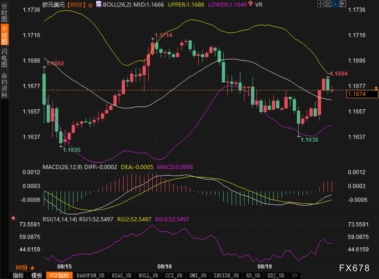 从小时图走势观察,欧元/美元在经历前期1.1714一线附近寻得短期支撑,随后反弹至1.1684附近受阻。目前布林带指标显示,中轨位于1.1666,布林上轨在1.1686,下轨在1.1646,汇价运行区间较为清晰,呈现区间震荡格局。