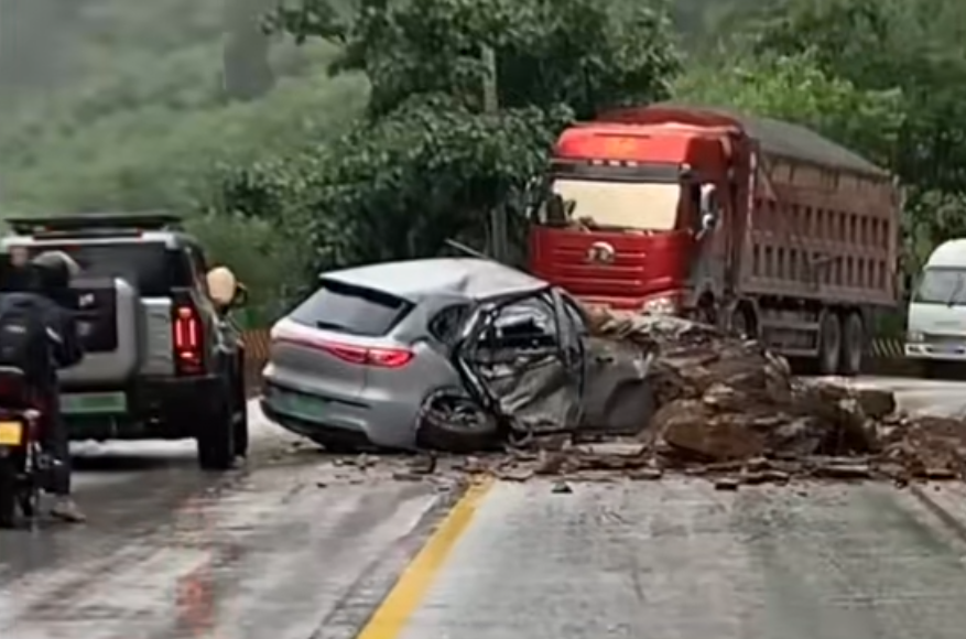 大理一公路突发落石砸中过路汽车。目击者:车头被砸毁,驾驶员吓呆了。