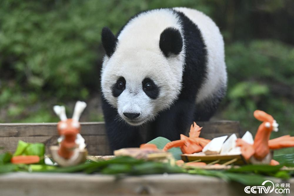 广州长隆野生动物世界保育员用胡萝卜、竹子为大熊猫“萌萌”“妹猪”母女制作“端午大餐”。
