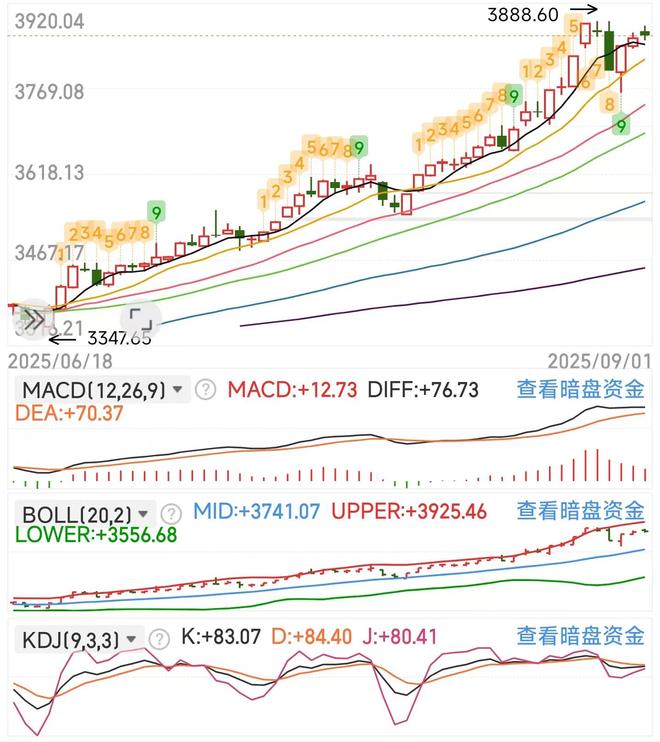 :中期看指数已经走出了十字星,来到了多空关键时刻,只要量能保持在2.5万亿以上,就能顶着指数继续向上扩展空间,但是一旦量能下降,技术指标就可能触顶回调,所以目前量能很关键。·日线日均线日均线;MACD指标金叉,红柱缩短,指标线轴上方运行;KDJ指标死叉向下收敛,J值探底拐头;BOLL通道开口扩散,股指在上轨下方运行。