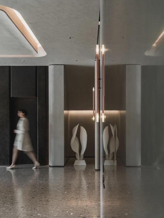 更加协调美观;同时伴有玻璃顶和灯带,这样的设计是地库的必然,能在视觉上起到拓宽的作用。