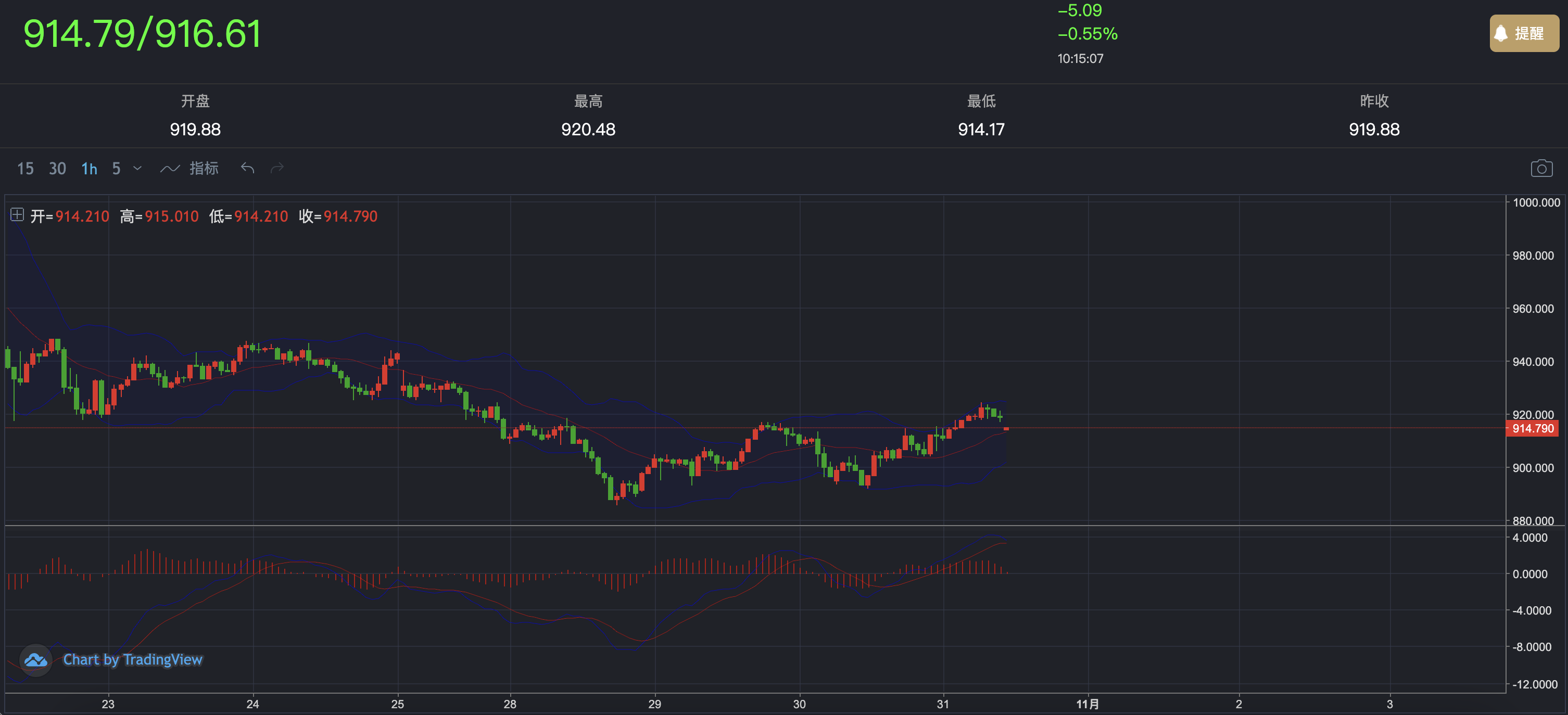 AG真人平台官网融通金1小时图显示,价格在约915附近震荡,近期多次触及布林带上轨但未能突破,显示多头动能逐步减弱。价格目前依托中轨均线支撑运行,若这一位置守住,短线仍偏向震荡偏多。