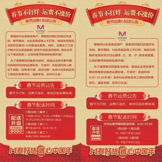近日,大润发M会员店宣布新春运费不涨价、线上线下不打烊;上线春节好礼次日达、好礼代寄全国送等配送服务。M会员店还于春节前推出宠物进店系列友好服务,成为首家宠物友好会员制商店。会员在M会员商店APP每天16:00前下单,超2000款常温商品次日即可送达,满199元且10kg以内还能享受包邮服务。