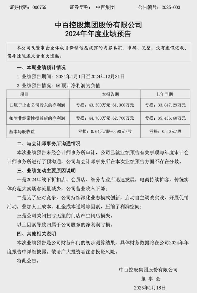 1月18日,中百集团公告,预计2024年度净亏损4.33亿元-6.13亿元,上年同期亏损3.38亿元;扣除非经常性损益后的净利润亏损4.47亿元-6.27亿元,上年同期亏损3.54亿元;基本每股收益亏损0.64元/股-0.9元/股,上年同期亏损0.5元/股。
