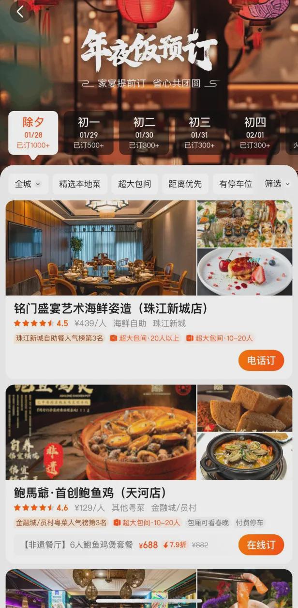 美团数据显示,截至1月16日,美团上“年夜饭预订”“年夜饭餐厅推荐”相关搜索量月环比提升256%,年夜饭线%,“非遗美食”需求激增。最新数据显示,超百万餐饮商户在美团报名“春节不打烊”活动,年夜饭线上预订、外带配送、吃住玩一站式等服务新模式涌现,进一步激发春节餐饮消费市场活力。