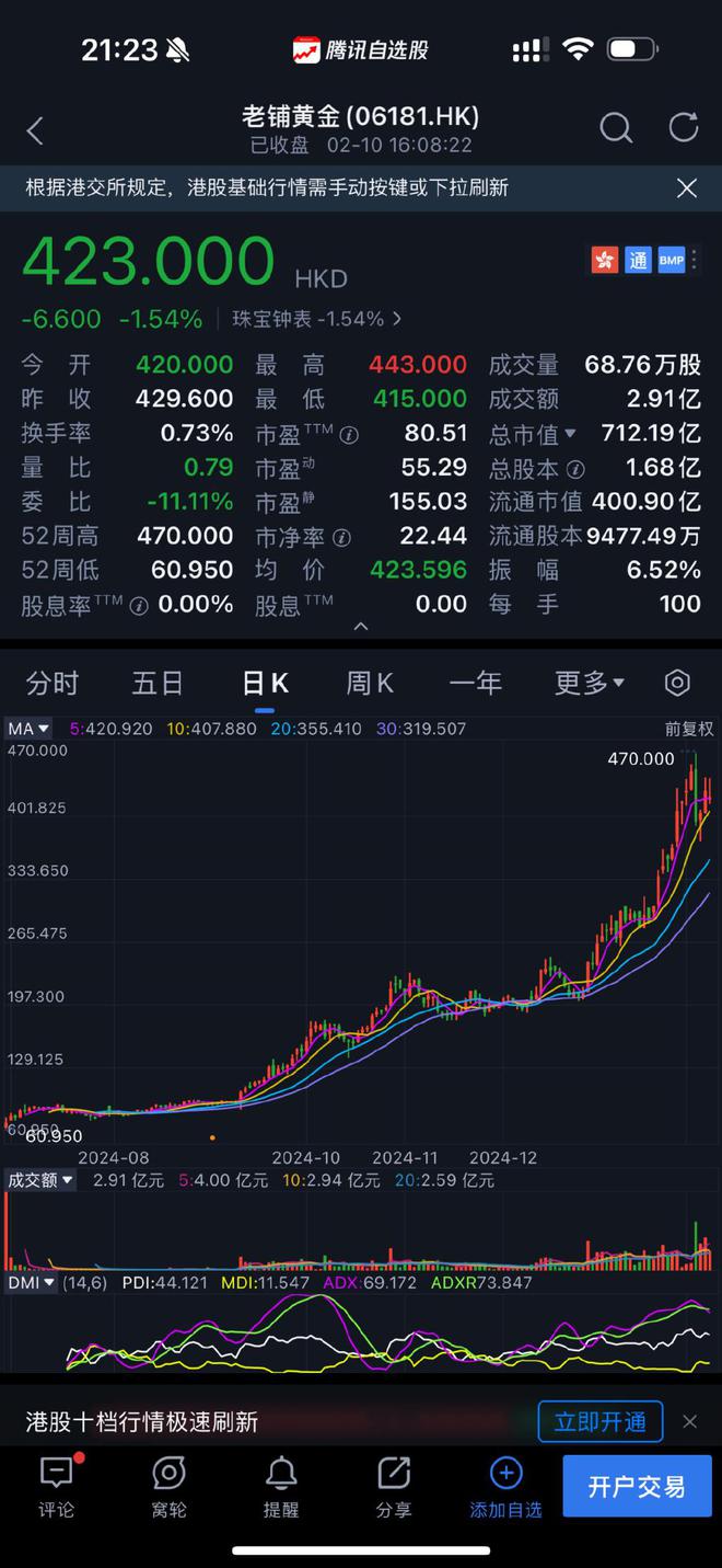消费者对老铺黄金的追捧更是反映到了资本市场。不到半年时间,老铺黄金在港股的股价暴涨10倍——截至2月10日收盘,老铺黄金每股价格423港元,相比之下,2024年6月底上市发行价只有40.5港元。