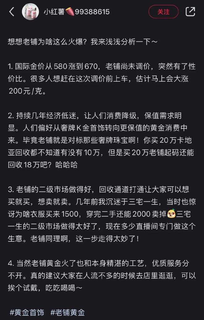 还有网友表示,其实买老铺黄金就是冲着他更保值去的。这也使得老铺相对卡地亚等外资珠宝高奢品牌的溢价率较低、保值性更高,受益于高端消费理性化的时代趋势的品牌有了立足之地。