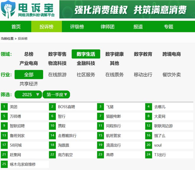 其中数字生活上榜平台有25家:投诉量TOP10依次为:美团、BOSS直聘、飞猪、去哪儿、万师傅、智行、猫眼电影、大麦网、智联招聘、携程;排在第11-25名的是:同程旅行、联联周边游、鲁班到家、走着瞧旅行、航班管家、饿了么、58同城、淘票票、滴滴出行、soul、赶集网、南方航空、高德、T3出行、啄木鸟家庭维修。