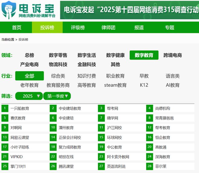 其中数字教育上榜平台有28家:投诉量TOP10依次为:一只船教育、中安建培教育、帮考网、尚德机构、赛优教育、中安建培、嗨学网、常青藤爸爸、对啊网、潭州教育;排在第11-20名的是:沪江网校、帮考教育、网易云课堂、恒企教育、小叶子陪练、聚力成师教育、中公教育、高教通;排在第21-28名的是:VIPKID、明世在线、阿卡索外教网、深海教育、掌门1对1、腾讯课堂、英语流利说、菲尔莱。