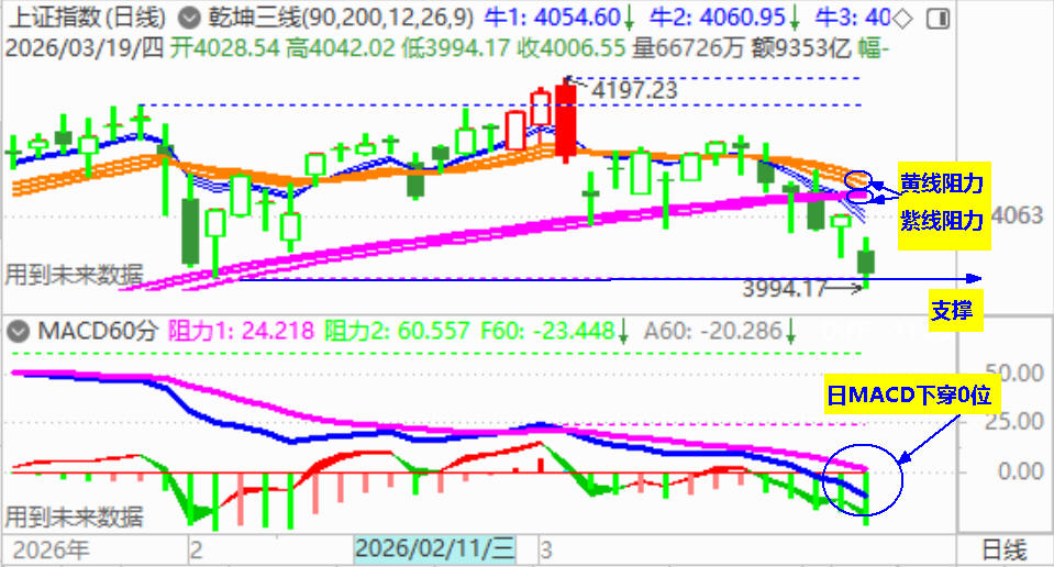 4000点保卫战已经打响,预期大盘在4000点附近能获得支撑并展开反弹,大盘反弹重要阻力是4090点处的日乾坤三线紫线,其次是日乾坤三线之黄线。