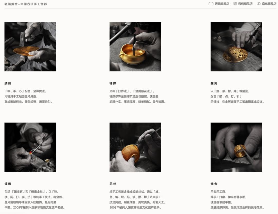 而据老铺黄金官方介绍,他们的制金工艺为“中国宫廷古法制金工艺”,源自北京工美花丝厂制金老匠师,其中的花丝镶嵌制作技艺,由原清宫廷造办处金匠一脉传承而来,是国家级非物质文化遗产。