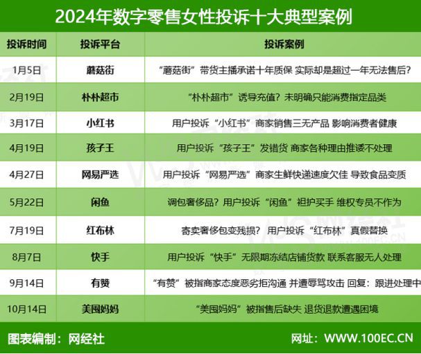 在数字零售领域中,据“电诉宝”受理用户维权案例,我们从中选取2024年女性网购十大典型投诉案例,涉及蘑菇街、朴朴超市、小红书、孩子王、网易严选、闲鱼、红布林、快手、有赞、美囤妈妈。