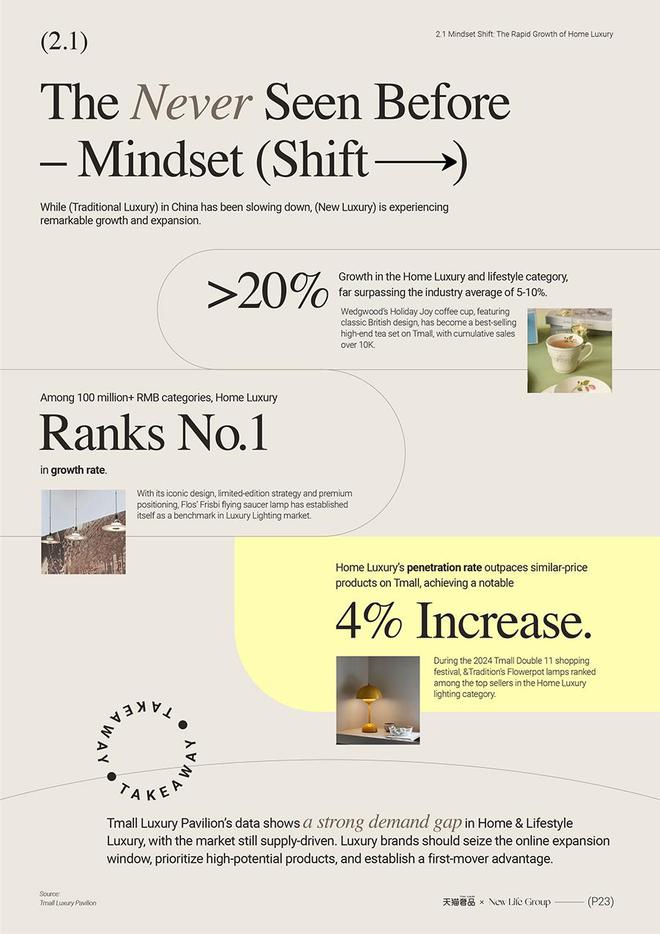 近日,天猫奢品携手战略合作伙伴 New Life Group 发布了行业白皮书《New Wave of Luxury: Home & Lifestyle》(以下简称“白皮书”),首次聚焦大生活方式家居类目,深度解读了当下中国家居奢品市场的变革和机遇,释放出不少重要信号。