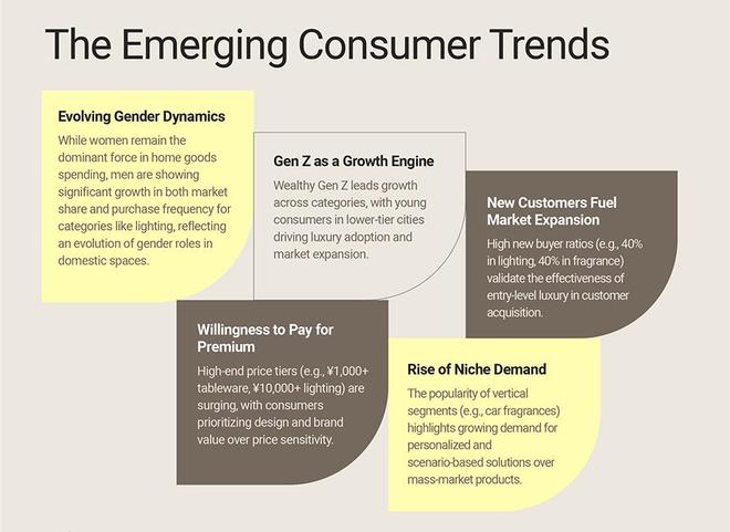 此外,家居香氛(30% 的市场份额和 5% 增长率)和艺术装饰(10% 的市场份额和 3% 的增长率)也都保持了可观的数据和稳定的势头,它们持续体现着大众对于生活趣味的在意和对生活品质的追求。