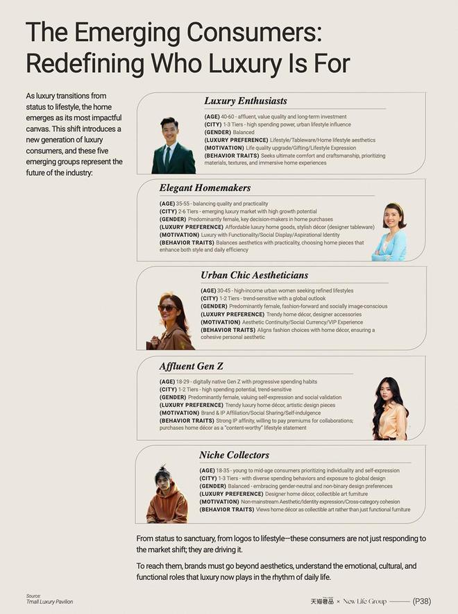 去年,天猫奢品发布 8 大策略人群,为当下国内奢侈品消费绘制了一份全新的核心人群图谱,其中,“奢享生活家”、“雅致新管家”、“都市新丽人”、“千金 Z 时代”和“小众私藏范”5 大人群也正是当下推动家居奢品市场蓬勃发展的主力军。