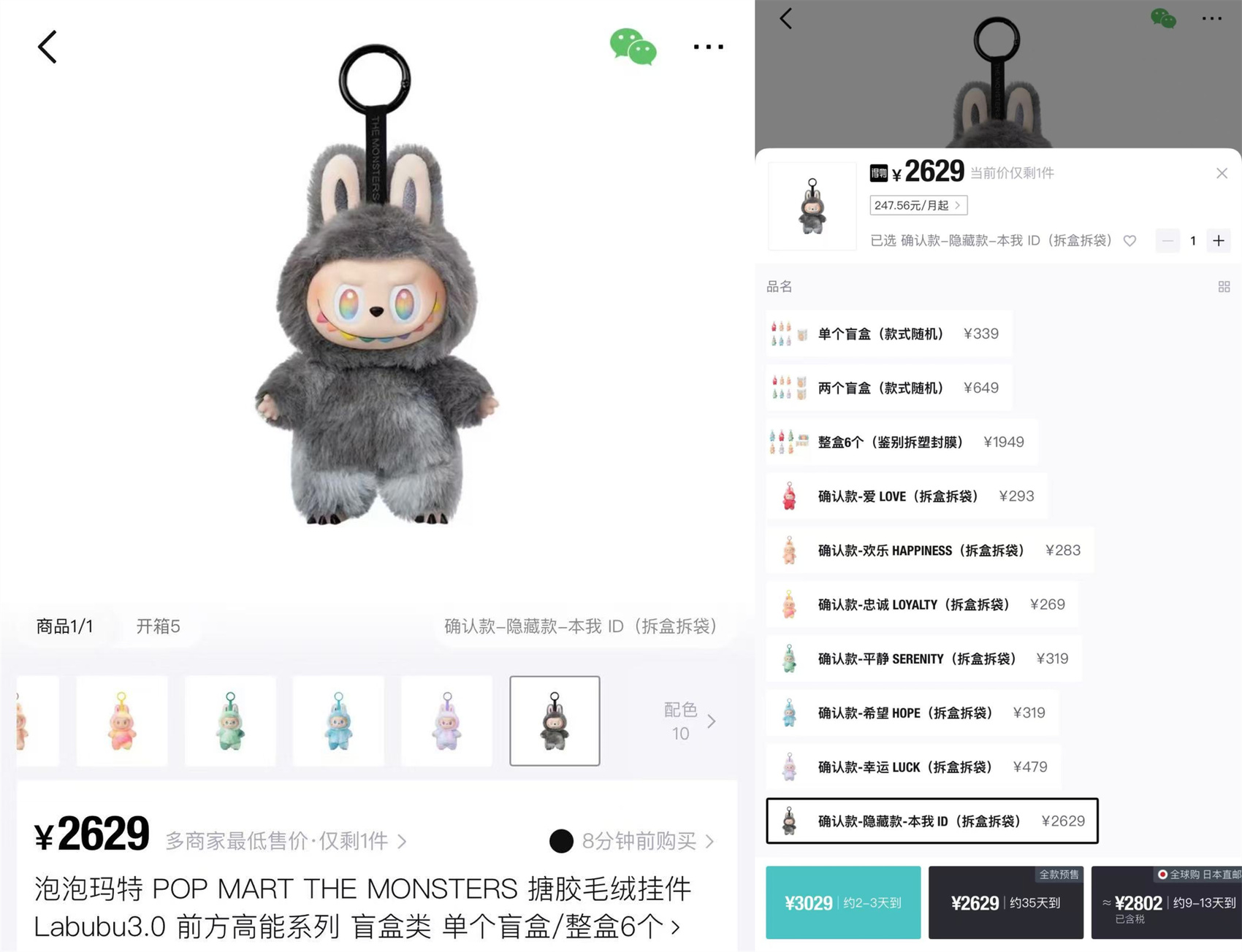 与火出圈相伴的,是其价格的飙升。5月29日下午,记者在两个二手交易平台上看到,二手LABUBU均为平台上的热销商品。其中,原价99元的LABUBU3.0版本搪胶毛绒隐藏款“本我ID”现货售价最高达3029元,预售价也炒至2629元,一端(整盒6个)的售价也直逼2000元大关。