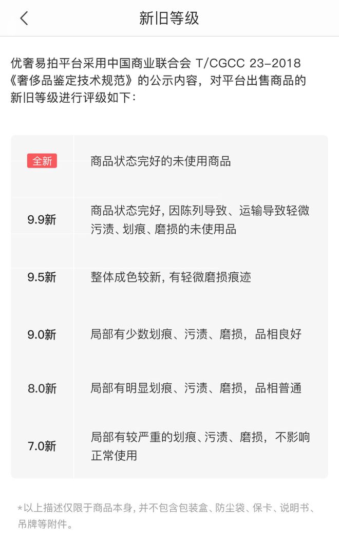 不同评级方式都会依据商品的整体成色和具体细节来判定等级,优奢易拍平台采用中国商业联合会T/CGCC 23- -2018《奢侈品鉴定技术规范》的公示内容,对平台出售商品的新旧等级进行评级,具体分为全新、9.9新、9.5新、9.0新、8.0新、7.0新进行等级判断。