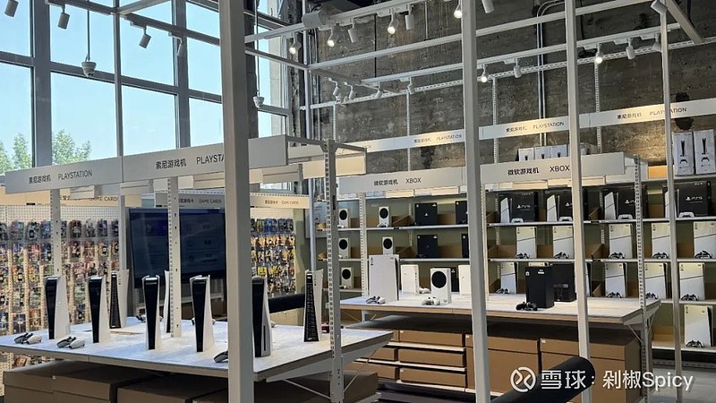 穿过包袋区,右侧的科技生活区清晰展露转转的多品类野心。被戏称为“男生专区”的游戏机区,成排的PS5游戏机、Switch以及满墙的游戏卡带,几个年轻人正围在PS5前讨论“9成新的性价比”;