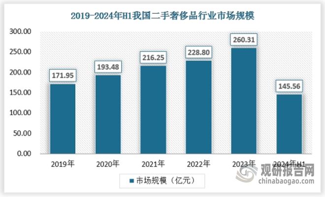 二手奢侈品市场涵盖了多个细分品类,如箱包、服饰、腕表、珠宝等,这些品类具有高度的标准化和强大的市场关注度,便于销售。中国2023年奢侈品消费超过一万亿元,大众奢侈品消费的持续增长,加之奢侈品保值、低损耗的天然属性,为二手奢侈品市场的发展预留了空间。中国奢侈品消费长期处于高涨幅势态,尤其在2019-2021年受消费回流政策及疫情影响,高消费人群境外消费回流。2023年中国二手奢侈品行业市场规模为260.31亿元,同比增长14%。