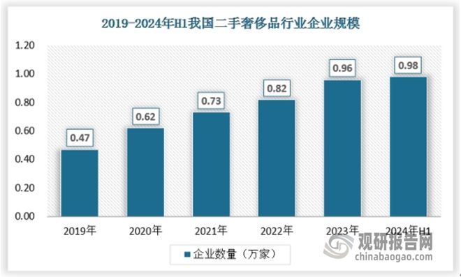随着二手奢侈品行业的发展,二手奢侈品企业也逐渐增加,截止2024年上半年我国二手奢侈品企业数量已经达到9000多家,同时,许多互联网二手奢侈品企业开始诞生,较大的有京东的TOPLIFE和寺库以及胖虎。